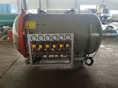 在工作的過程中罐內(nèi)會(huì)有抽真空的步驟,一般來講該設(shè)備都是多路抽真空的,罐外可以看到有著一排的真空表進(jìn)行每一個(gè)管路進(jìn)行抽真空,我們?yōu)榱俗寜毫_(dá)到我們想要的結(jié)果還要對罐內(nèi)進(jìn)行加壓,壓力作用于制品上這樣就能更快的滲透和固化使得整個(gè)熱壓固化過程加速,一般來說現(xiàn)在的熱壓罐都是高壓熱壓罐。
